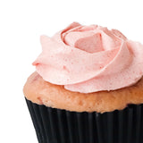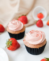 Vegan and nut egg free fresh strawberry cupcake frosted with strawberry cream.
