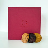The box contains 16 pcs of our signature cookies: Nutty Cocoa Cookies (5 pcs), Raspberry Blanc Cookies (5 pcs), and Cocoa Munch Cookies (6 pcs).