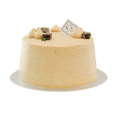 Earl grey chiffon cake layered with earl grey cream and black sugar mochi frosted with earl grey white chocolate ganache.
