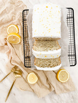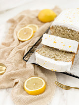 Moist vegan lemon chia pound cake frosted with lemon zest cream.